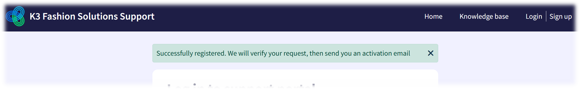 We will review the request (which may take a business day), and using your email domain and what you entered into the "Name of your company" box, we'll link you up to the correct company in our system, and send you an activation email which will ask you to set a password (check your junk mail, example email shown below which will be received from fashionsupport@k3btg.com)